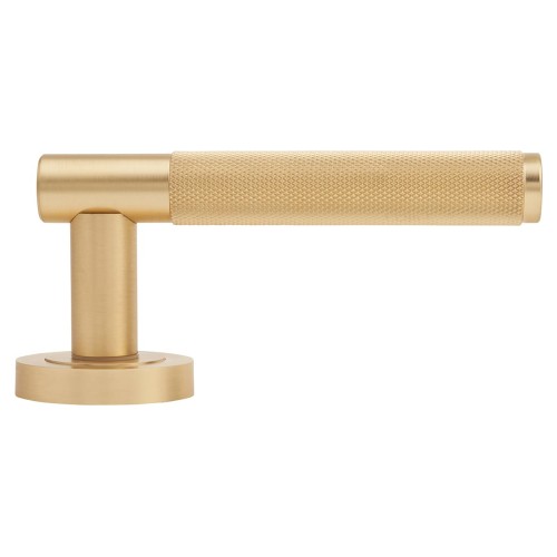 • Jedo Satin Brass Fire Rated Knurled Door Handles on Round Rose - Bari Range