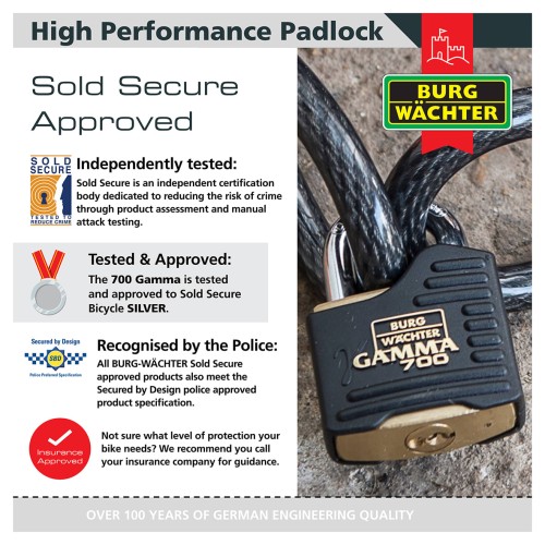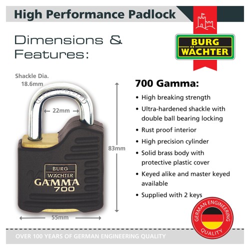 • The gamma is keyed alike, sold secure approved, premium brass padlock body with a protective plastic cover and ultra-hardened shackle