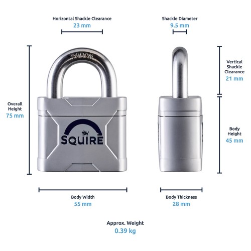 • Squire Mercury High Security Padlock - 50mm Body - 23.5 x 22mm Shackle - Silver
