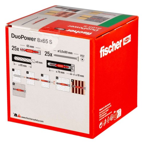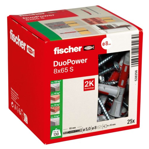 • Fischer DuoPower Long Nylon Wall Plug with Screws - 8 x 65mm - Red & Grey - Pack of 25