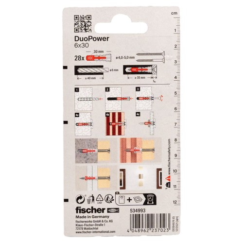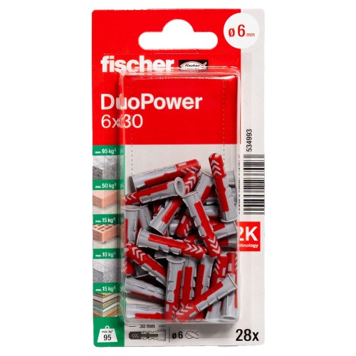 • Fischer DuoPower Nylon Wall Plug - 6 x 30mm - Red & Grey - Pack of 28