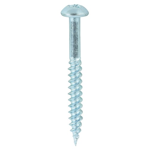 • Pozi round head wood screw used on softwoods for clamping to flat surfaces or to achieve a high aesthetic finish