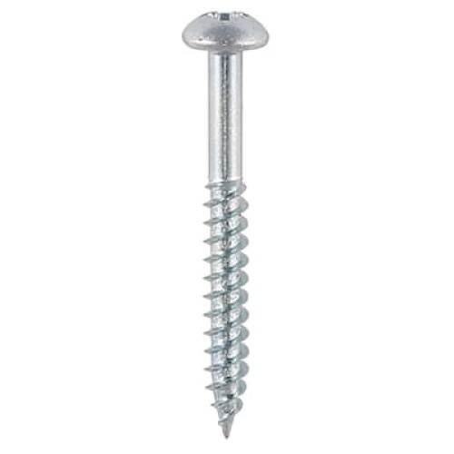 • Pozi round head wood screw used on softwoods for clamping to flat surfaces or to achieve a high aesthetic finish