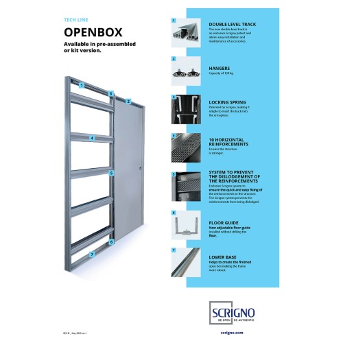 • Scrigno OpenBox pocket door kit with jamb is a single sliding door system offering a sleek and space-saving solution for residential and commercial interiors that eliminates the need for swing space making this ideal for small rooms, narrows hallways or areas where a traditional door might obstruct the movement