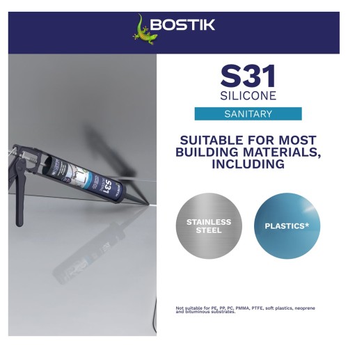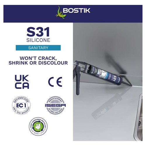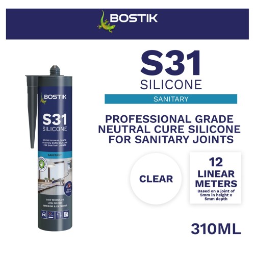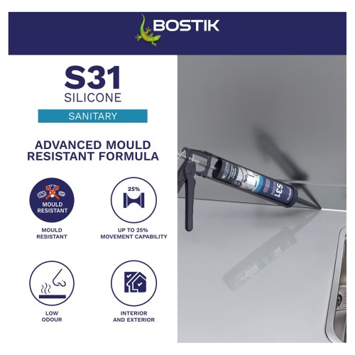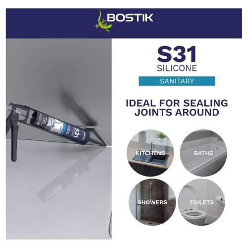 • Bostik S31 neutral cure sanitary silicone is ideal for sealing joints around baths, sinks, toilets, showers, kitchen furniture and more