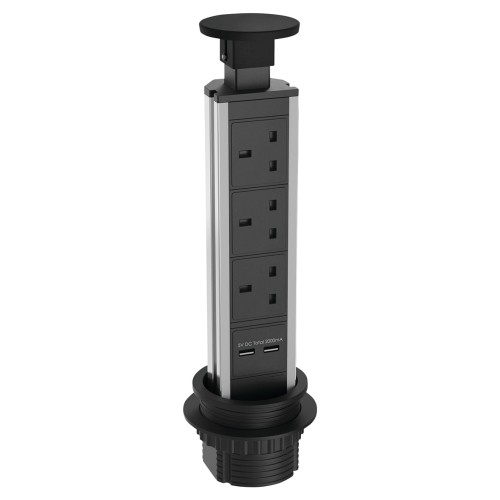• A pop-up socket with a spring mounted handle, ideal for kitchens with a shortage of power outlets