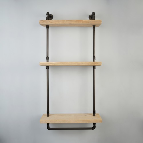 • 3 tier drill through pipe shelf kit with hanging rail allows you to create your own industrial looking shelving with a useable hanging rail - simply use your own shelf and fixings, everything else is included!