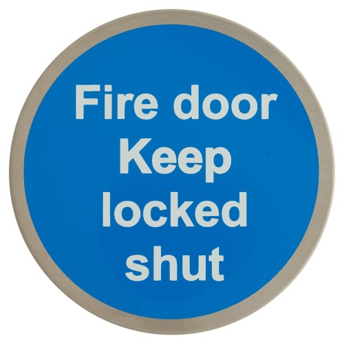 • Exel Fire Door Keep Locked Shut Door Sign - Self Adhesive - 75mm Diameter - Satin Stainless Steel