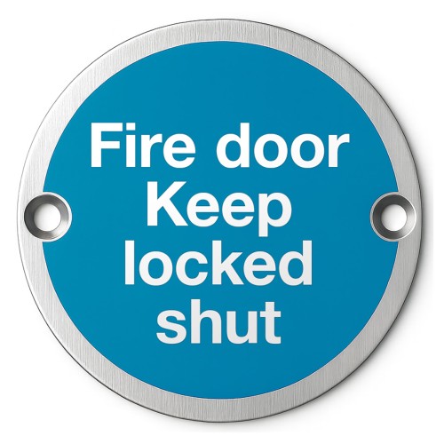 • Exel Light Blue Fire Door Keep Locked Shut Door Sign - 75mm Diameter - Satin Stainless Steel
