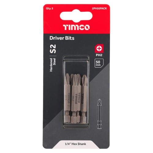 TIMCO Steel Driver Bits - Phillips - PH2 - 50mm Length - Pack of 5