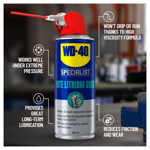 • Reduces friction on door slides, hinges, bearings, chains and more