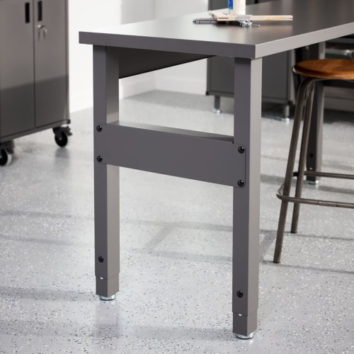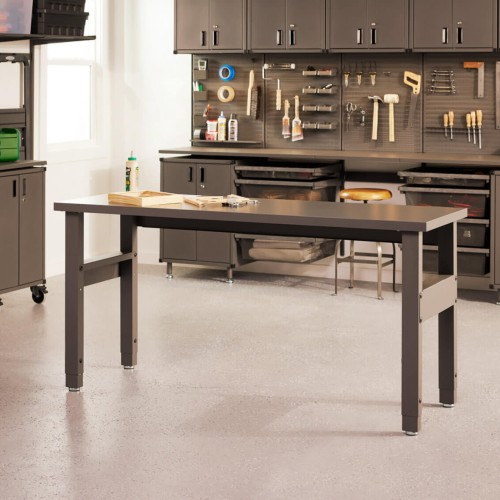 • The elfa Garage+ workbench is a height adjustable workspace ideal for garages, sheds and workshops