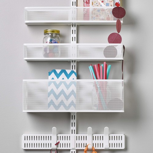 The medium mesh basket clips to the twin slot wall upright and top track hanging wall bar, which can be secured to the back of a door, in a wardrobe or in a pantry on a top track system - purchase to build your own elfa system or to extend on a premade kit