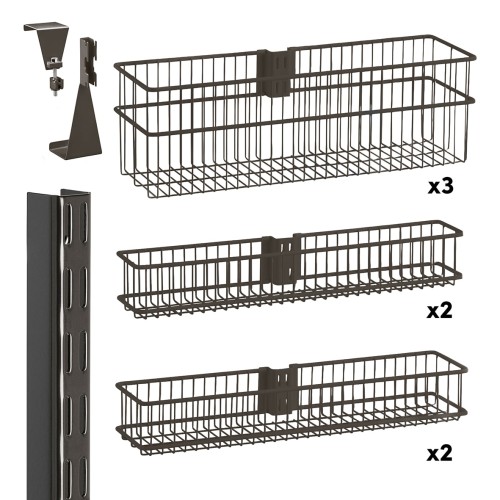 Kit contains: 1 x twin slot 1980mm wall upright, 1 x over door hook set, 3 x deep wire baskets for door and wall racks - 435 x 135 x 140mm, 2 x medium wire baskets for door and wall racks - 435 x 104 x 70mm, 2 x shallow wire baskets for door and wall racks - 435 x 80 x 70mm