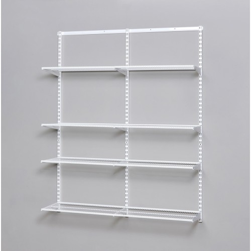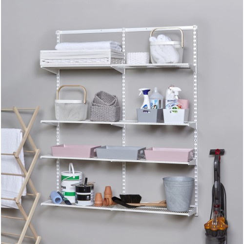 • Kit contains: 1 x 936mm top track, 3 x 1532mm top track hanging wall bars, 6 x ventilated wire shelves - 902 x 305mm, 9 x click in shelf brackets - 320mm length, 1 x screws and plugs fixings pack